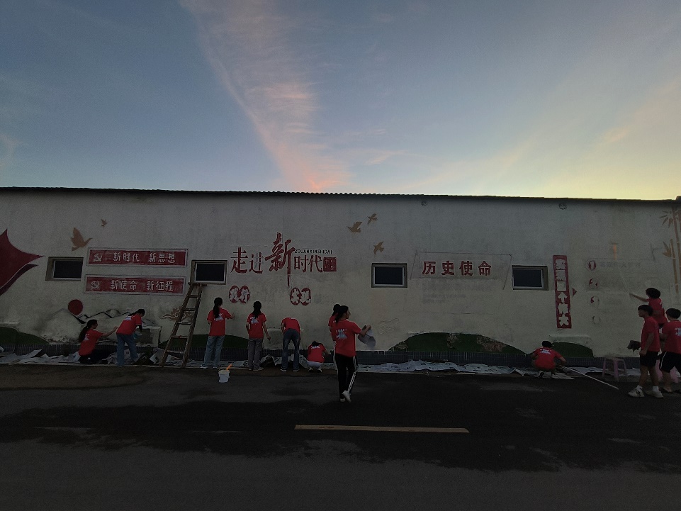 上午十点,隆都镇党委书记魏思超、副镇长李沫彦一行专程前来慰问红星突击队的队员们。他们不仅关心队员们的身体状况,还强调了安全作业的重要性,表示镇政府和村委会将全力支持红星突击队的工作,为他们的实践活动提供必要的帮助和保障。这份来自政府的关怀与支持,让队员们倍感温暖。烈日炎炎下,突击队员们连续奋战近五个小时,汗水浸湿了衣背,却无一人言退。面对天气预报中的雨云,他们更是争分夺秒,只为在雨水到来前完成墙面的底色填充。这份坚持与毅力,正是青春最美的注脚。