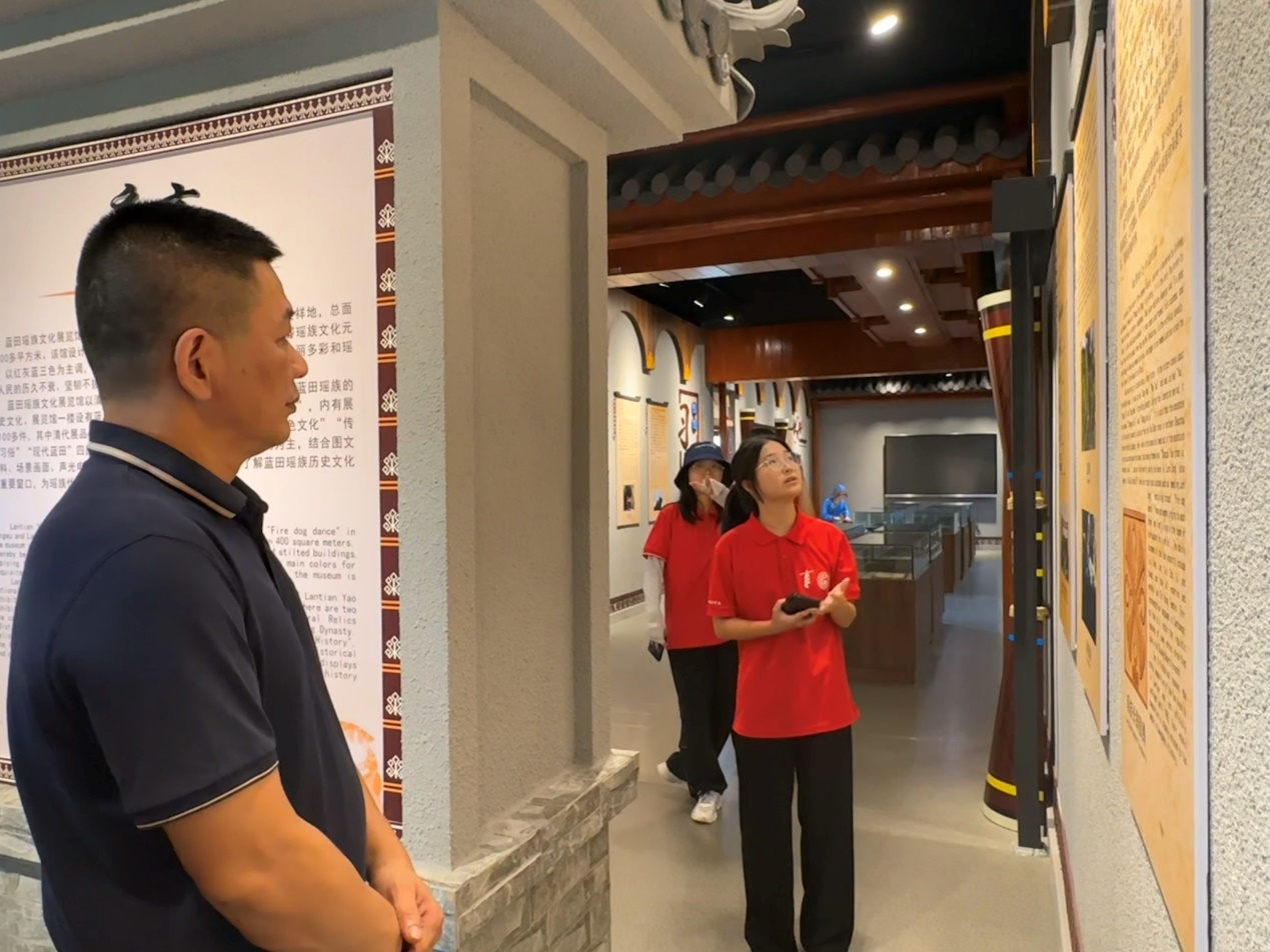 座谈会结束后,政校企领导走到蓝田瑶族文化展览馆,倾听“青翼”突击队队员及“织带仔”非遗传承人热情讲解“织带仔”“舞火狗”“瑶族穴居”的传统文化故事。