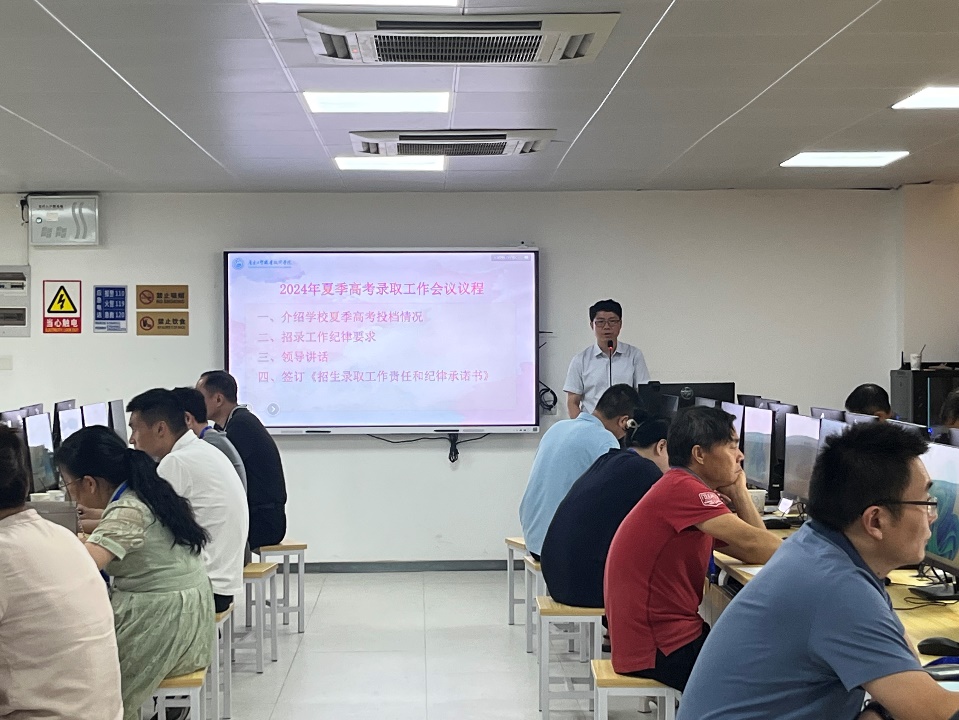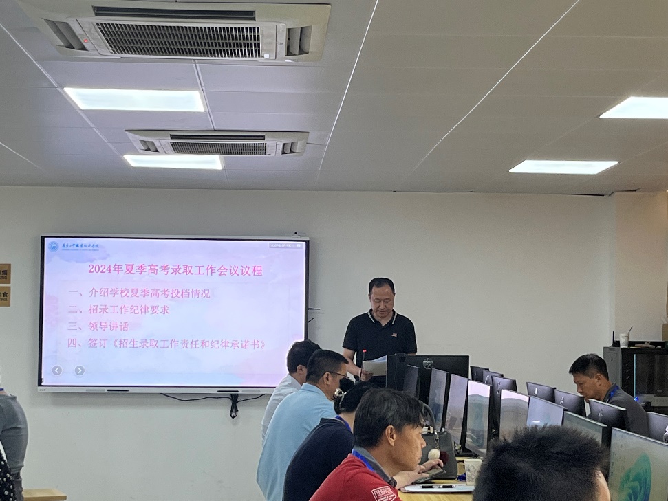 会上,徐勇军简要回顾了学校春季分类招生录取工作,全面介绍了夏季高考投档总体情况。他指出,2024年学校面向全国15个省(市)招生总计划8200人,春季高考已完成4557人录取任务,夏季高考计划招录共3643人(其中广东省3265人,其他14个省市378人)。他结合上级主管部门有关招生工作规定,提出应站在维护教育公平、维护社会和谐稳定的高度,把实现平安高考、暖心高考、阳光高考作为深化学习贯彻习近平新时代中国特色社会主义思想主题教育来抓实抓细抓好;用讲政治、讲规矩、讲纪律要求和以“以生为本”理念,公平公正公开开展招生录取工作;加强专业投档数据对比和分析,优化招生类型,持续精准补短,持续提升学校、二级学院和各专业的办学水平。