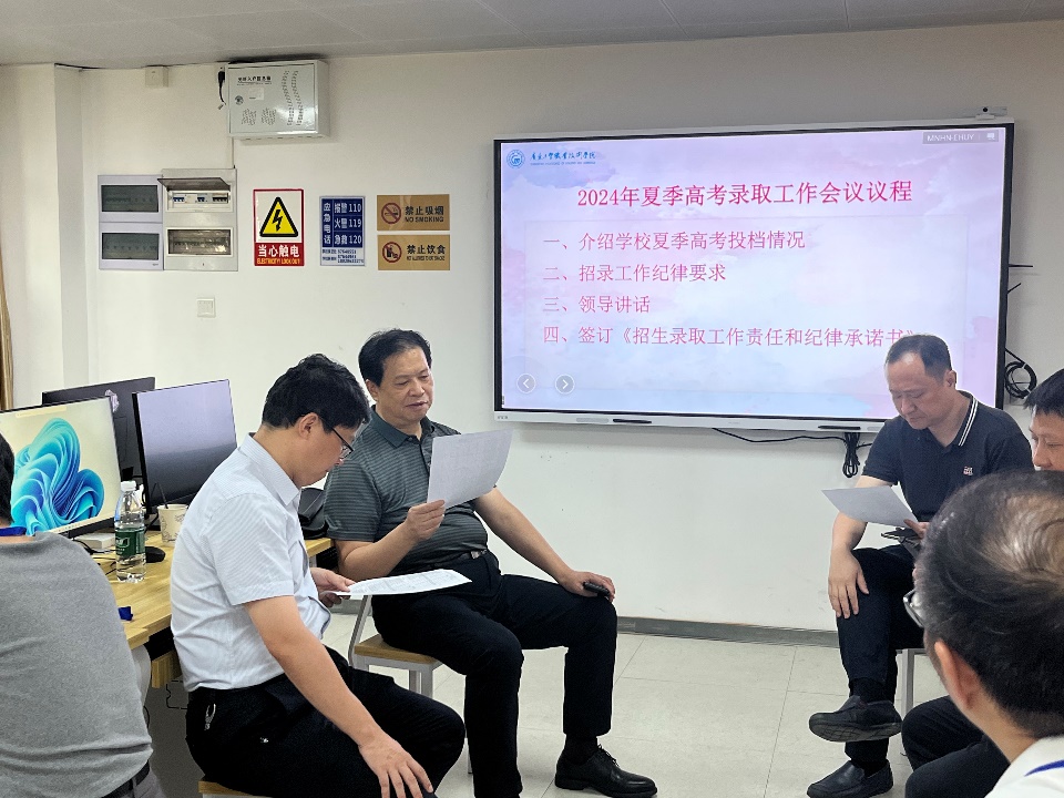会上,陈斌传达了广东省教育考试院2024年普通高校招生录取工作动员会议上精神,强调要本着对党、对人民极端负责的态度深入实施招生录取“阳光工程”,把《中国共产党纪律处分条例》的学习要求和高校招生“十严禁”“30个不得”“八项基本要求”等规定贯穿于招生录取工作全过程,严格遵循《招生章程》依规依章开展招生录取工作,认真答好招生录取这“后半张卷”。