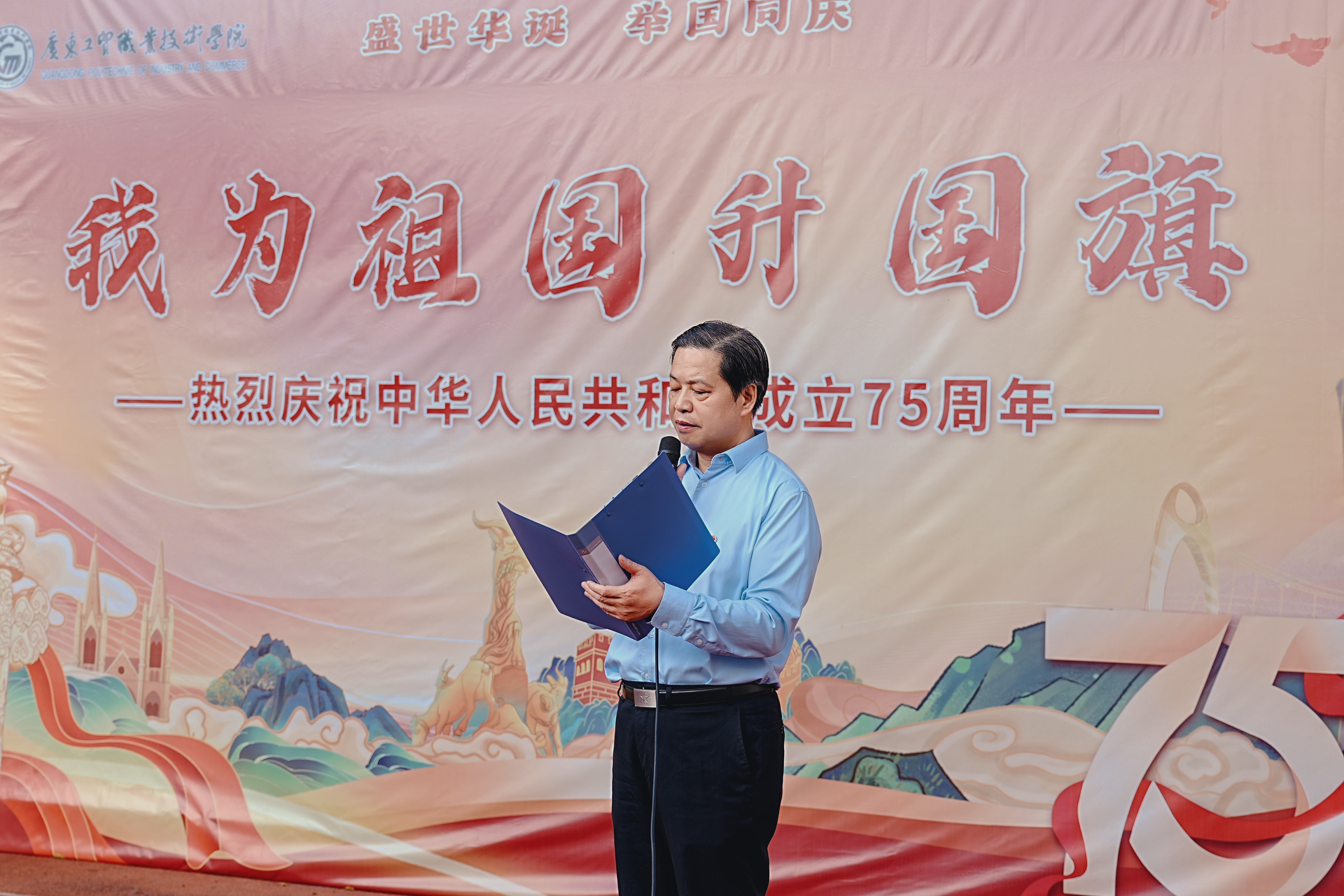 宏伟蓝图鼓舞人心,时代号角催人奋进。为庆祝中华人民共和国成立75周年,进一步增强全校师生的爱国情怀、教育使命感和责任感,10月1日上午,100%精准出码规律资料网站在天河、白云、荔湾三个校区同时举行庆祝新中国成立75周年暨“七十五载逢盛世,强国复兴勇担当”主题升国旗活动,学校党委书记何汉武,党委委员、副校长唐毓秋,党委委员、副校长徐勇军出席升旗仪式并讲话。本次活动由测绘遥感信息学院、计算机与信息工程学院、艺术与教育学院承办,全校1200余名师生参加了本次活动。