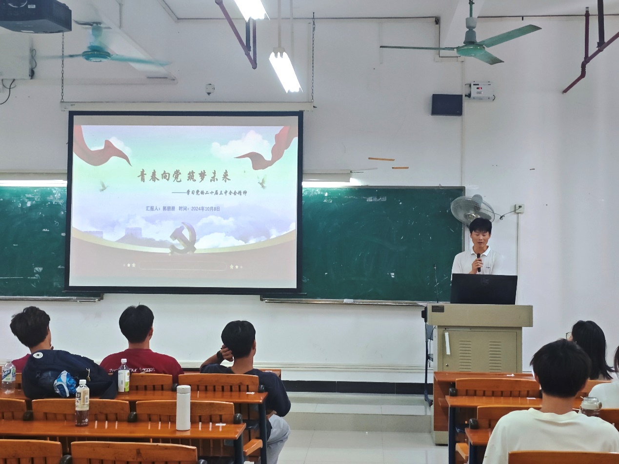 为学习贯彻党的二十届三中全会精神,进一步巩固思想共识,凝聚磅礴之力,深化党的建设,全面提升学生政治素养与使命感,汽车工程学院于2024年10月8日下午在白云校区明德楼二区202开展党的二十届三中全会精神“六队百人”宣讲活动,汽车工程学院辅导员郭朋朋及2023级新能源汽车技术专业学生出席本次活动,该活动由郭朋朋主持。