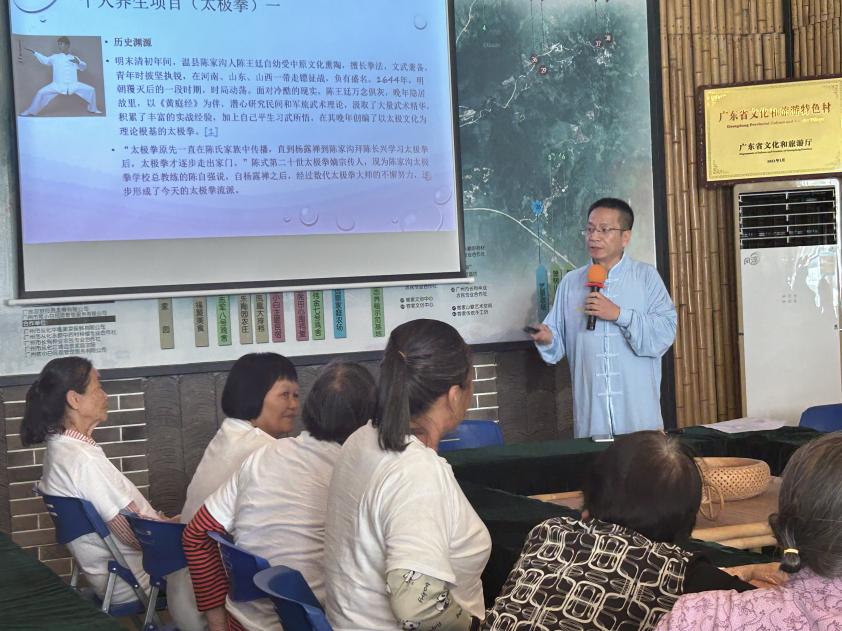 为丰富乡村老年人的精神文化生活,展现新时代老年人的精神风采,让社区老年人度过一个运动与健身并存的别样重阳节,进一步丰富社区老年人的文化体育生活,营造崇尚健身、参与健身、健康文明的社区氛围,10月11日至12日,在重阳节来临之际,“广东工贸—从化江埔街凤二村全媒体助力乡村振兴社区教育示范基地”项目团队于从化江埔街凤二村,开展了一场别开生面的“太极庆重阳,夕阳展风采——老年人太极拳培训”活动。此次活动涵盖老年人健康讲座、太极拳介绍与太极拳实操学习。活动由经贸学院副院长蒋晶主持,卢岩老师讲授,参与人员主要有经贸学院教师黄诗媛、张莉、陈秋娜、李彩丽等教师、学生第二党支部学生党员、积极分子代表、凤二村村委、村民老年朋友等。