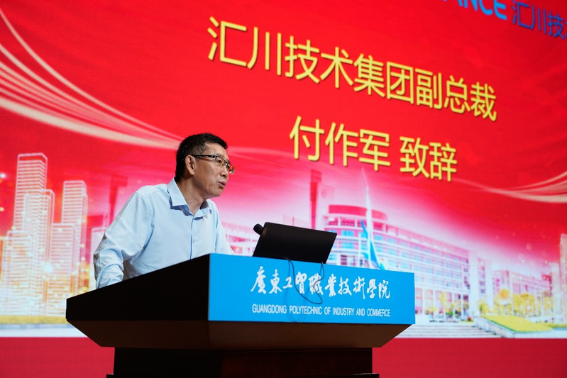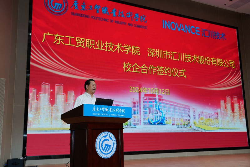何汉武代表学校向出席仪式的企业领导及成员表示热烈欢迎,指出学校作为培养大国工匠、能工巧匠、高技能人才的主阵地,要深化产教融合,加强与行业龙头企业深圳市汇川技术股份有限公司合作办学、合作育人、合作就业和合作发展的四合作,推动学校办学能力再创新高。