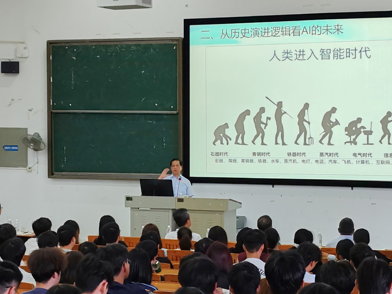 为推动人工智能(简称AI)与教育深度融合、为教育变革提供新方式,引领我校人工智能领域科技创新、人才培养和技术应用示范,学校组建《人工智能素养与技能》课程建设团队,致力于培养一大批具有人工智能素养的教师和学生,把人工智能技术深入到教育教学和管理全过程、全环节,让学生青年一代更加主动地学,让教师更加创造性地教。2024年10月22日下午,学校党委书记何汉武在明德楼2-104课室为2023级电子信息工程技术专业学生开展了以《人工智能时代背景下大学生如何锻造适应未来的能力》为题的人工智能通识课。学校党政办公室主任吴浩、教务部部长何军拥、汽车工程学院党总支书记朱永平、《人工智能素养与技能》课程团队及2023级电子信息工程技术专业1-4班学生等200余人一同聆听。