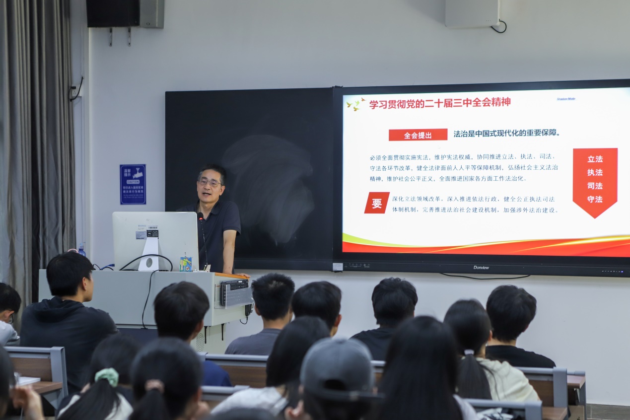 随后,余棉水围绕全会精神的核心内容从“深化改革”“城乡融合发展”“国家安全”等方面进行了详细阐述。他通过具体的案例和深入浅出的讲解,使同学们对全会精神有了更加全面、深刻的理解。同时,他结合了国际形势和计算机行业发展趋势带领学生们感受社会对人才需求的变化。