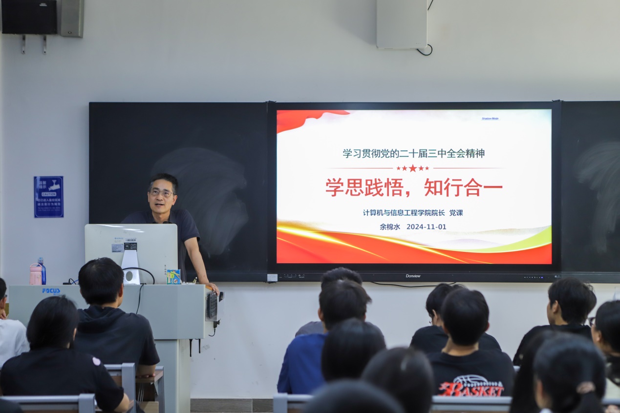 为深入学习贯彻党的二十届三中全会精神,进一步落实立德树人根本任务,加强学生的思想政治教育,激发学生的爱国情怀和社会责任感。111日下午15时,计算机与信息工程学院院长余棉水在天河校区教学楼103为入党积极分子们带来了以“学思践悟,知行合一”为主题的“院长第一课”。