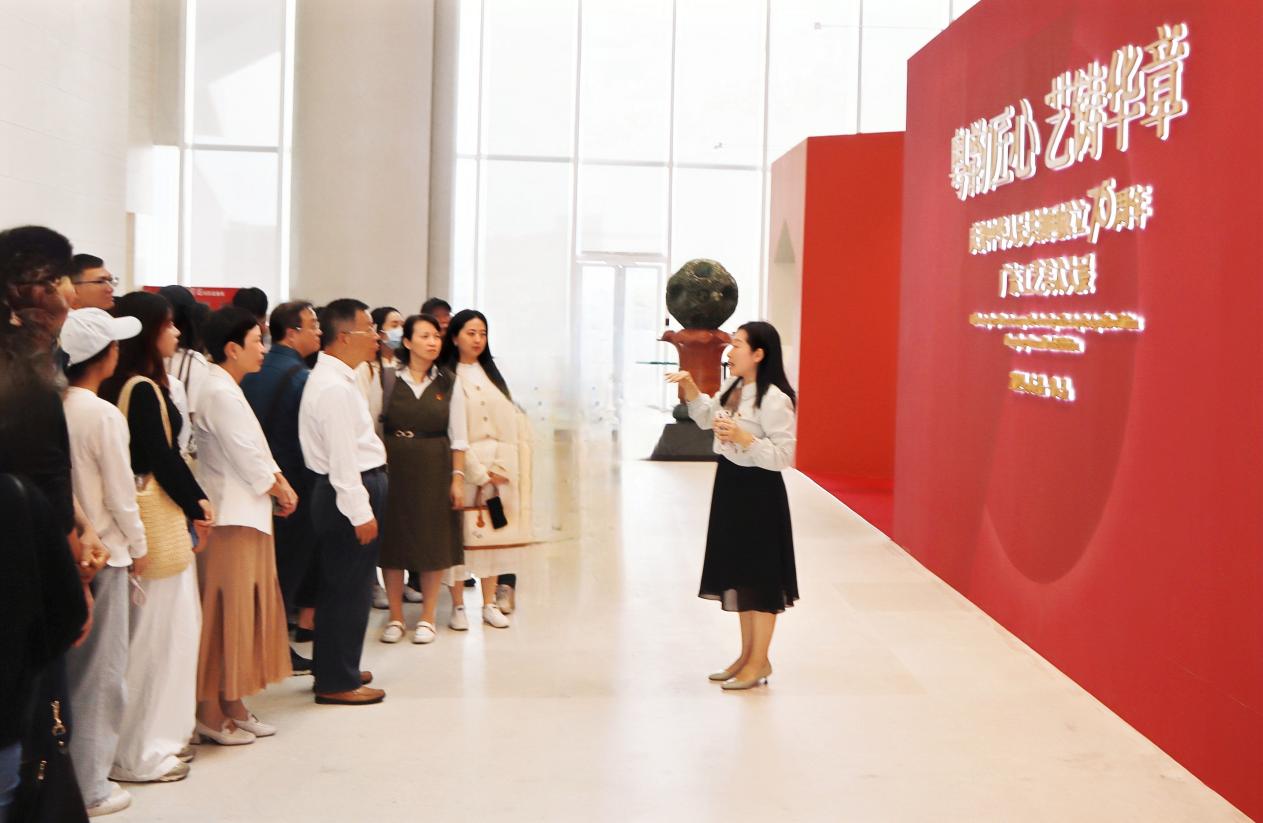 活动的第一站是广东美术馆。借参观“粤韵匠心·艺铸华章”展区之际,党总支书记周清莲同志通过现场党课的方式,向各位党员同志介绍了广东艺术的发展传承与历史积淀,让同志们深刻感受到岭南大地的改革之风包裹着人民对美和创新的追求,号召新时代的青年党员,更应当主动扛起责任,坚定文化自信与文化认同感,争做中华优秀传统文化声情并茂的讲述者、坚定笃行的传承者、继往开来的发扬者。课后,同志们陆续参观了“新时代 • 新跨越“系列大展”,在“强国建设”“美好生活”“绿美山河”等艺术板块中,充分感受新时代社会生活的发展变化和广东改革开放的建设成就。