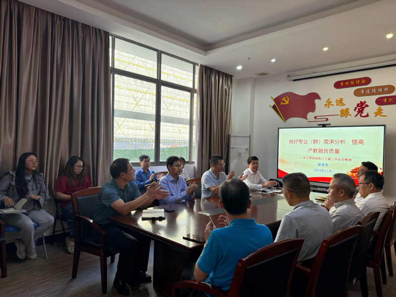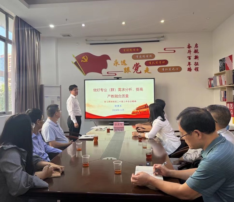 徐勇军将党的二十届三中全会精神与学校教育事业发展、“新双高”建设相结合,从“深化产教融合和教学改革,提高专业与产业适配度”方面进行阐述。徐勇军向大家讲解了专业与产业适配度的内涵,传达了《国家职业教育改革实施方案》《关于推动现代职业教育高质量发展的意见》《职业教育产教融合赋能提升行动实施方案(2023—2025年)》等文件的要求,并从结构、规模和需求三个方面向大家分析专业与产业之间存在的问题,从而提出提升专业与产业适配度的策略:一是要深化产教融合,实现教育过程与产业需求的有效对接;二是深化教育教学改革,提升关键办学能力。
