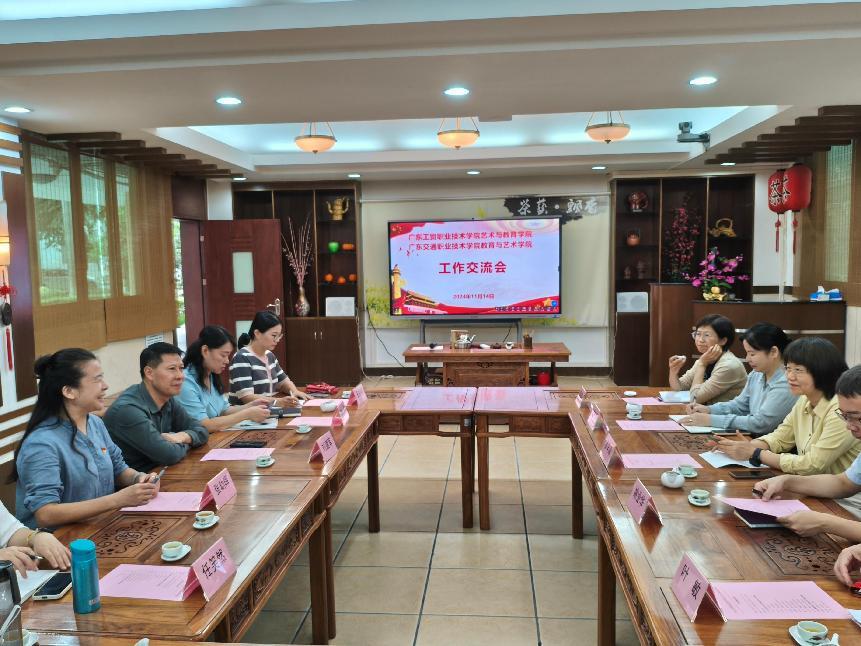 2024年11月14日下午,广东交通职业技术学院教育与艺术学院院长罗罕淑、副院长姚业华、副院长林旭兰等一行10人到访我校艺术与教育学院,开展工作交流。艺教学院党总支书记刘建军、院长张幼晖、学院办公室主任刘嘉等人在荔湾校区茶艺室热情接待了来访人员。双方就专业建设、教学管理等方面工作开展了深入交流与探讨。