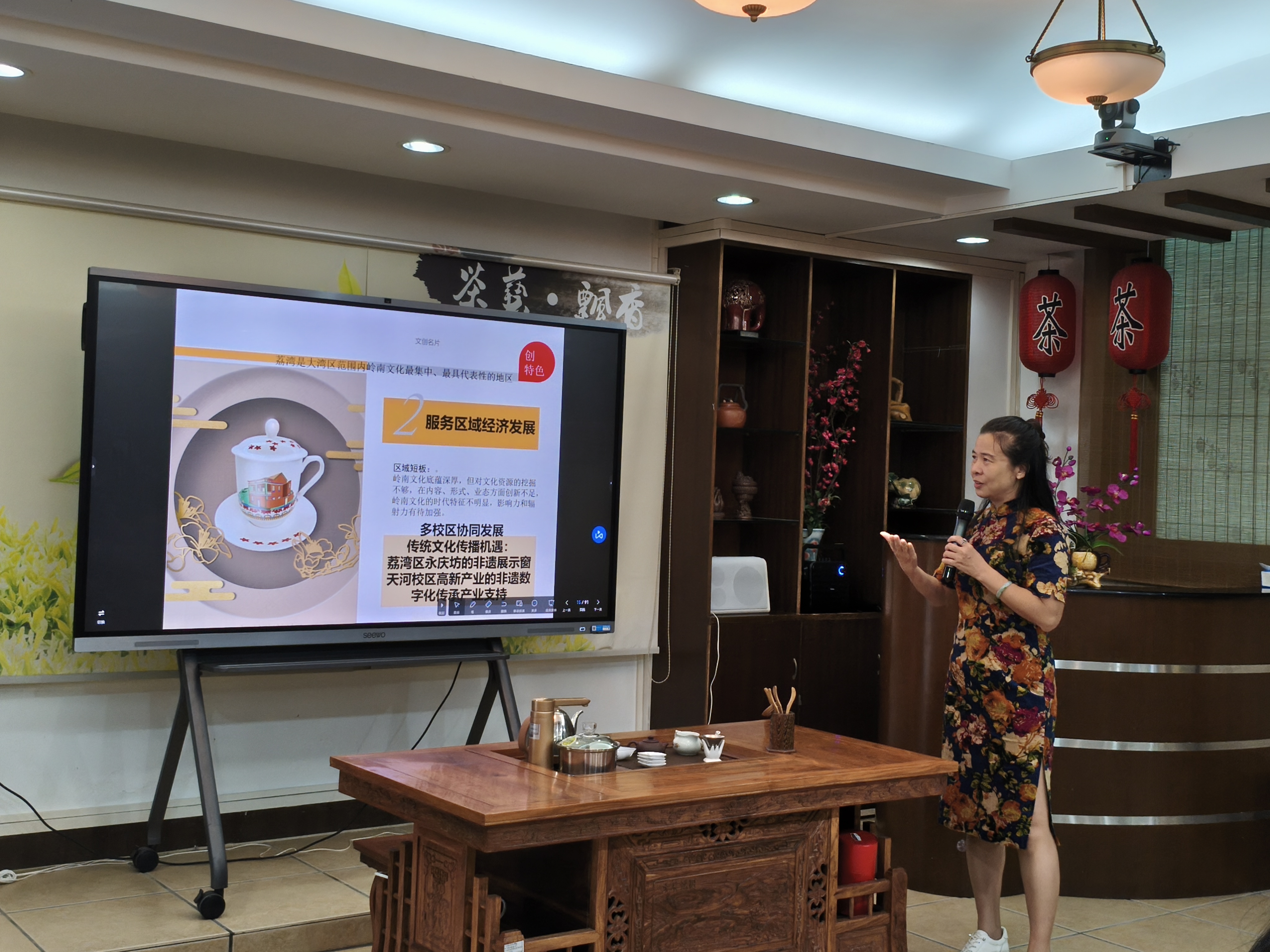 工作交流会在荔湾校区爱校楼一楼茶艺室热烈举行。张幼晖以“创新性传承——以文创为例”为主题,详细介绍了学院在非遗文化传承、文旅产品研发以及民族文化育人等方面的成果和经验。张幼晖强调,学院将继续以传承岭南非遗文化为己任,着力将传统文化技艺赋予当代的审美内涵。学院始终坚持以服务地方经济社会发展为己任,紧扣“传承岭南非遗、研发非遗文创”这一核心,在立足自身专业建设的基础上,努力实现成果转化,服务区域经济发展。