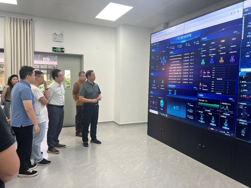 在信息化监控室内,卢志海详细汇报了学校的职业教育数字基座数据同步工作进展、网络运行状况、信息安全保障措施以及数据中心内部运行情况。随后,何汉武一行实地参观了数据中心机房,深入了解了数据中心的计算能力、能源消耗和制冷系统的运作情况。