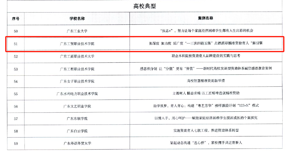 根据《广东省教育厅关于公布2024年度广东省学生资助典型的通知》(粤教助函〔2024〕4号)文件通知,我校学生资助工作案例《拓深度 加力度 延广度“三扶四链五强”点燃高职精准资助育人“新引擎”》入选广东省2024年度学生资助工作案例高校典型。