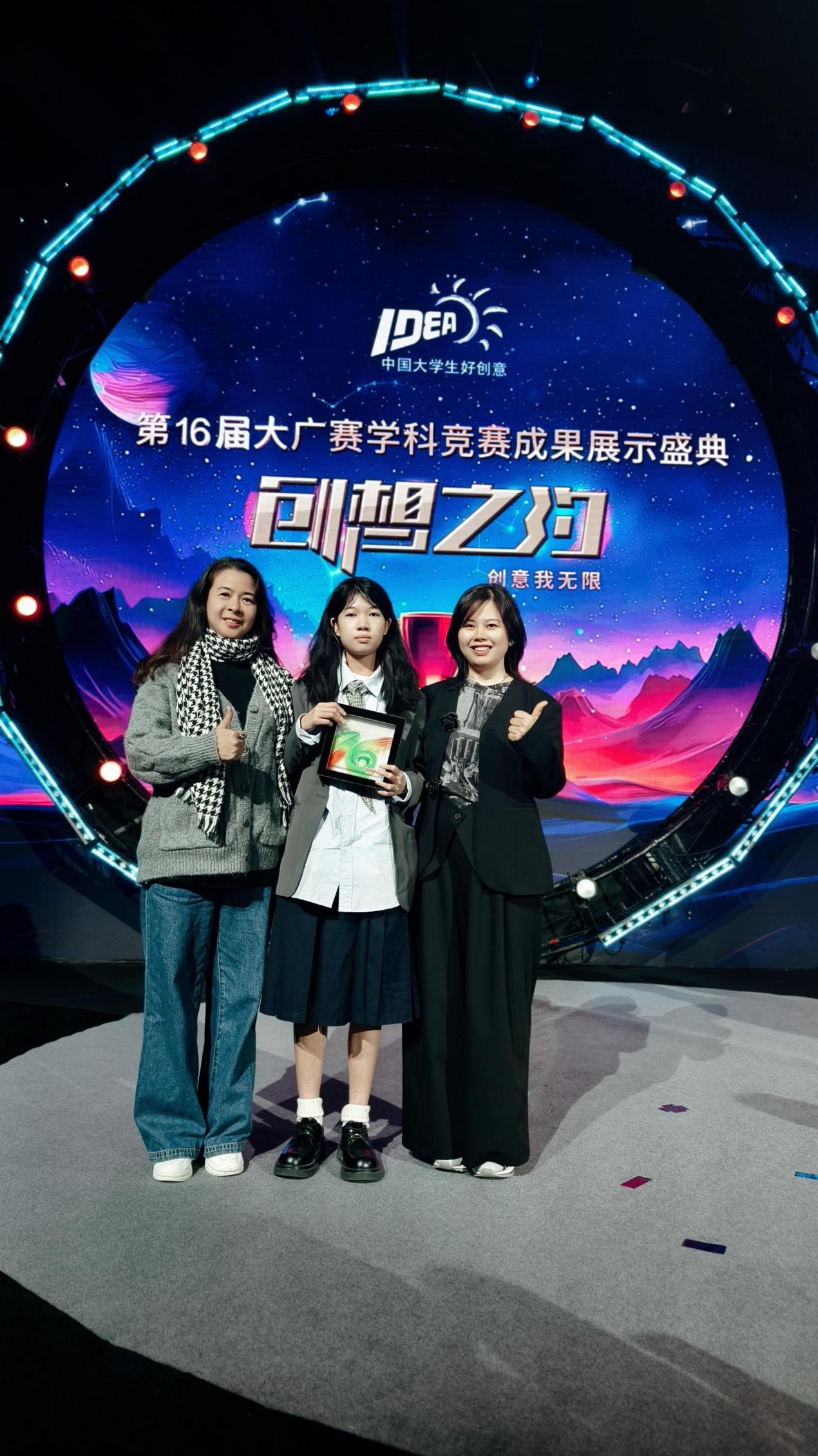 艺术与教育学院院长张幼晖、获奖学生林幸妍和指导老师黄春梅