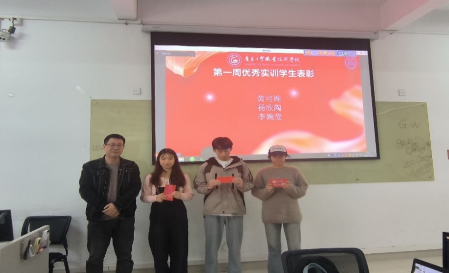 为表彰在实训中表现突出的同学,苍龙出海公司刘捷老师为黄可维、杨欣陶、李婉莹三位同学颁发了荣誉证书。刘捷老师表示,荣誉不仅是对个人努力的肯定,更是对全体学生的激励,希望同学们以此为榜样,继续保持积极进取的学习态度,争取更大的进步。