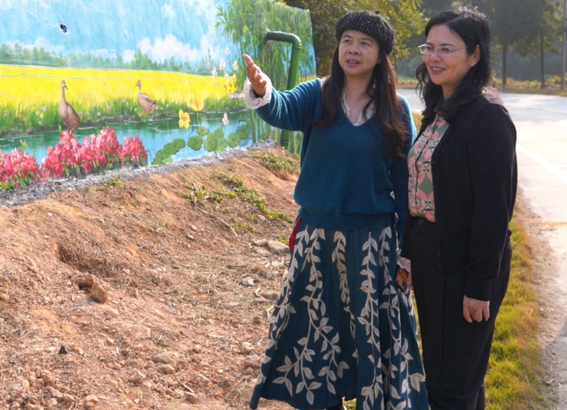 张幼晖向凤安镇党委书记叶宇娟讲解墙绘
