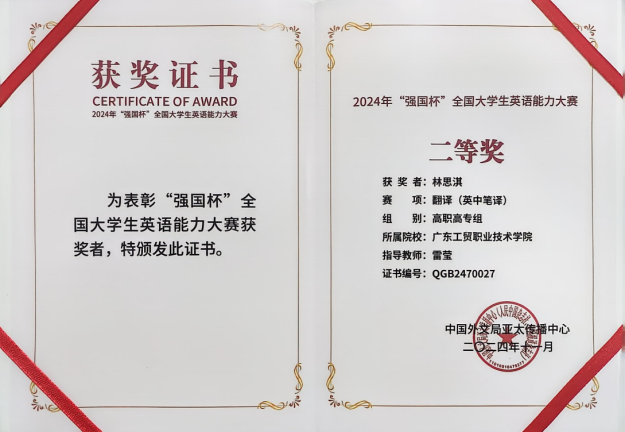 在由中国外文局亚太传播中心主办、广东省翻译协会协办的2024“强国杯”全国大学生英语能力大赛中,我校学子凭借深厚的英语功底、卓越的表达能力以及宽广的国际视野,在激烈的竞争中脱颖而出,斩获全国一等奖两项、二等奖两项及三等奖四项的骄人成绩。