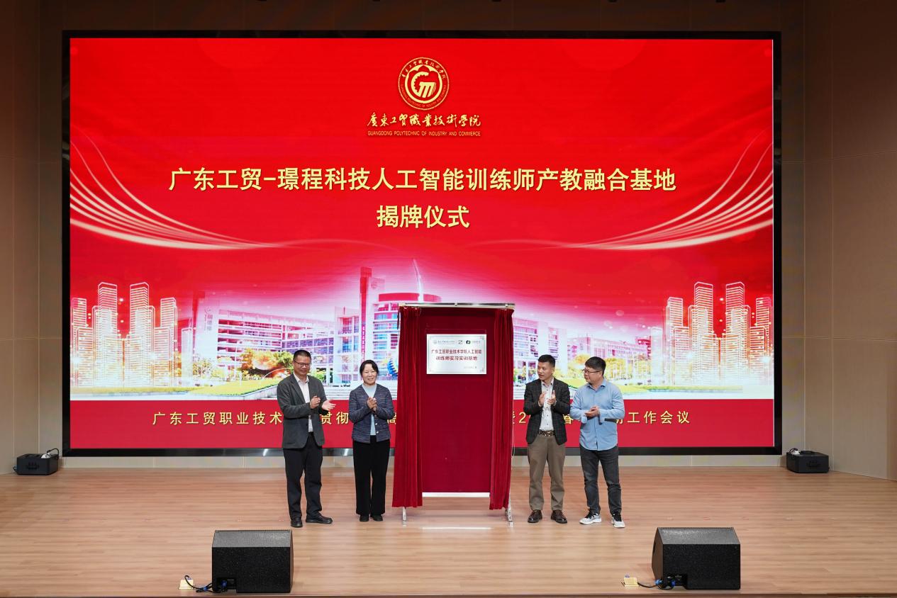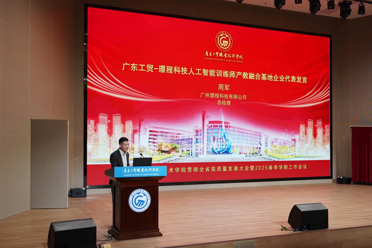 产教融合基地是产教融合的重要载体,广东工贸与广州璟程科技有限公司深度合作,共同成立了广东工贸-璟程科技人工智能训练师产教融合基地,并举行了广东工贸-璟程科技人工智能训练师产教融合基地揭牌仪式,赵红副校长为基地揭牌。产教融合基地企业代表--广州璟程科技有限公司周军总经理在会上发言。
