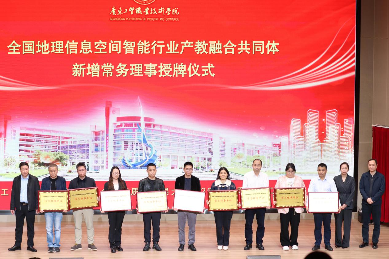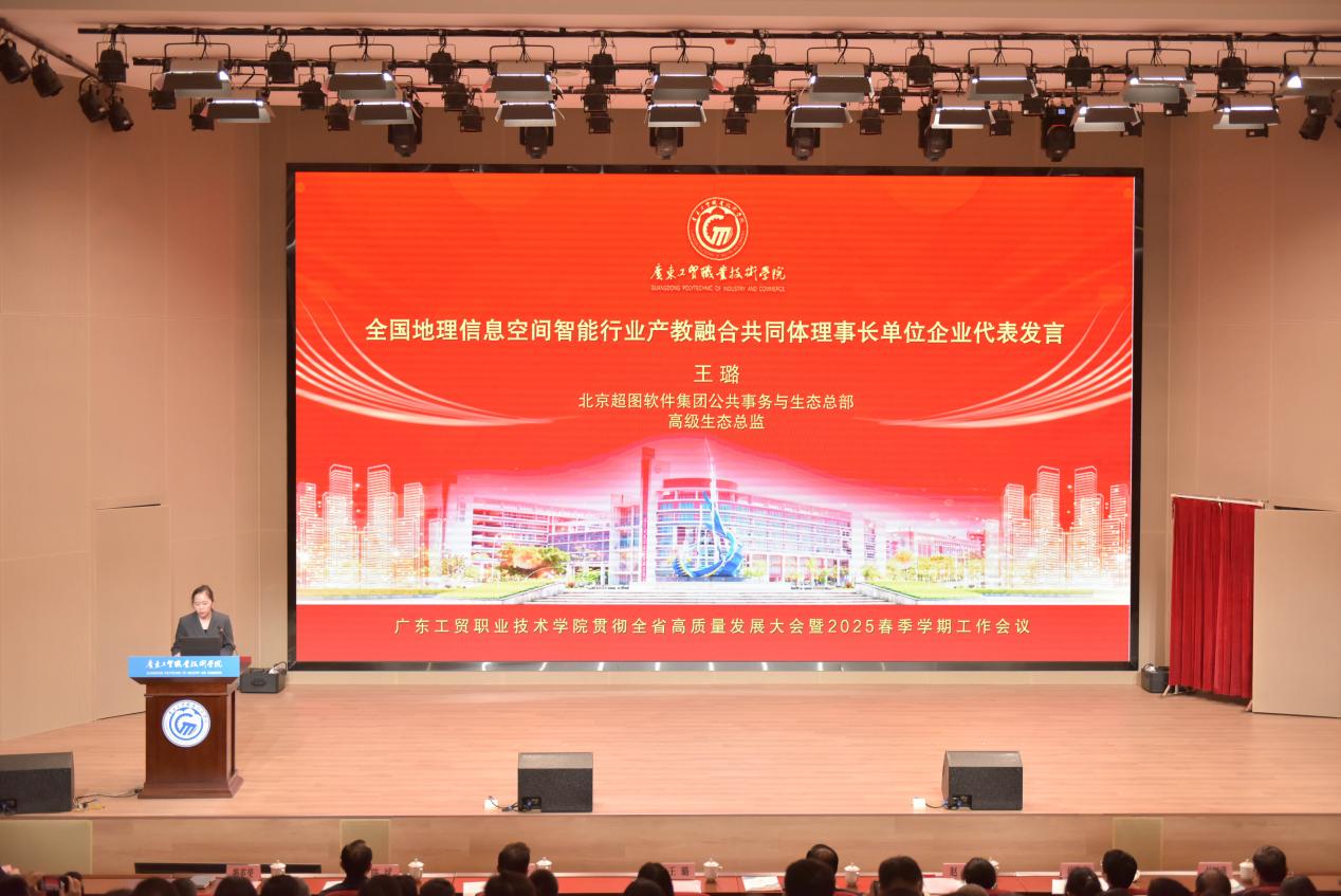 产教融合共同体是“新双高”建设的重要工作,全国地理信息空间智能行业产教融合共同体聚焦地理信息与空间智能领域,旨在深化产教融合、促进产教布局高度匹配、服务高效对接、支撑行业发展。产教融合共同体理事长单位代表北京超图软件集团公共事务与生态总部王璐高级生态总监在现场作了发言,与党委委员,副校长孙师家、党委委员,纪委书记陈斌上台为今年新加入的9家常务理事单位授牌。