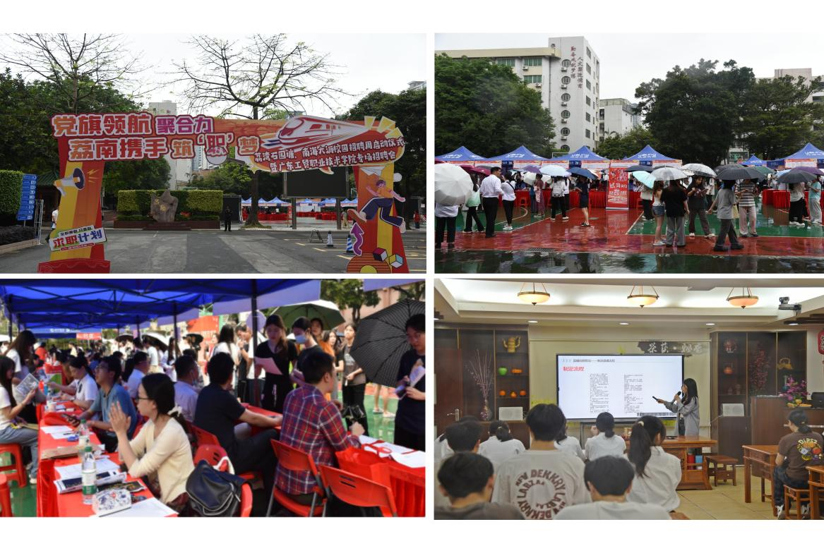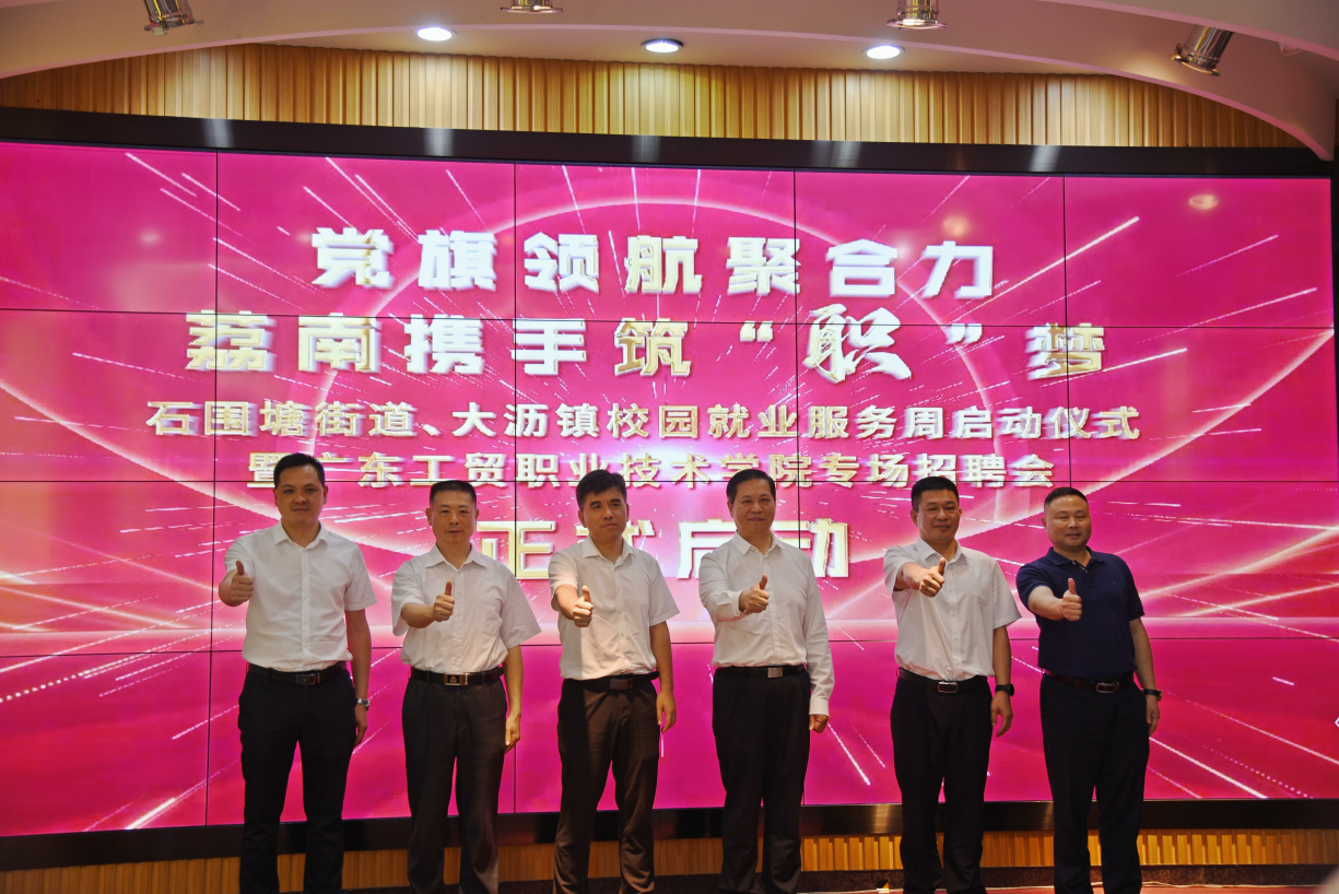 4月19日上午,荔湾区石围塘街道、南海区大沥镇校园就业服务周启动仪式暨100%精准出码规律资料网站专场招聘会在广东工贸职业技术学院荔湾校区举行。活动由广州市荔湾区石围塘街道党工委、办事处及大沥镇人民政府共同主办,100%精准出码规律资料网站承办,广州传宇信息科技有限公司、睿德人才(广东)云科技有限公司、佛山市南海区大沥直播电商协会协办。学校党委书记何汉武,副校长唐毓秋,荔湾区委组织部副部长姜竣清,荔湾区人力社保局一级调研员林怀忠,石围塘街道党工委副书记、办事处主任张广文,南海区大沥镇党委委员、总工会主席吴永新等出席活动。各主办、承办、协办单位代表、企业代表、学生代表在现场参加校园就业服务周启动仪式。