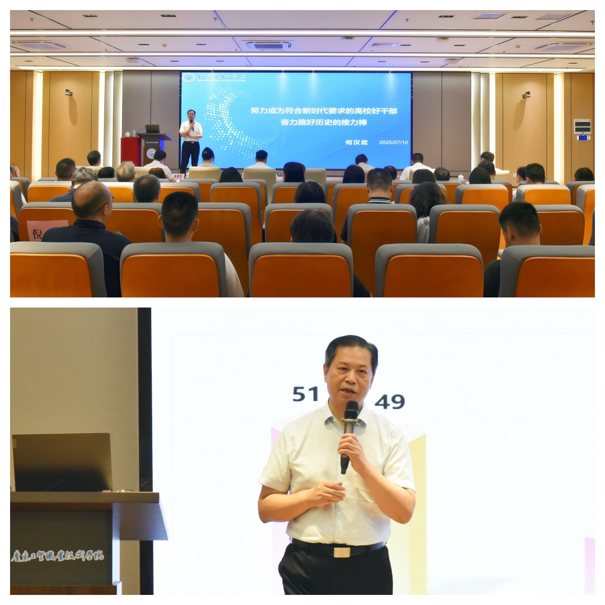 何汉武为参训干部作题为《努力成为符合新时代要求的高校好干部 奋力跑好历史的接力棒》的专题报告。他从职业教育发展新趋势分析入手,阐述了学校目前的发展机遇与挑战,并结合的学校发展历程、办学中存在的优势与短板,对中层干部提出了履职尽责的若干要求,列明学校近期重点工作任务,勉励中层干部要努力成长为符合新时代要求的高校好干部,奋力跑好学校发展的历史接力棒。