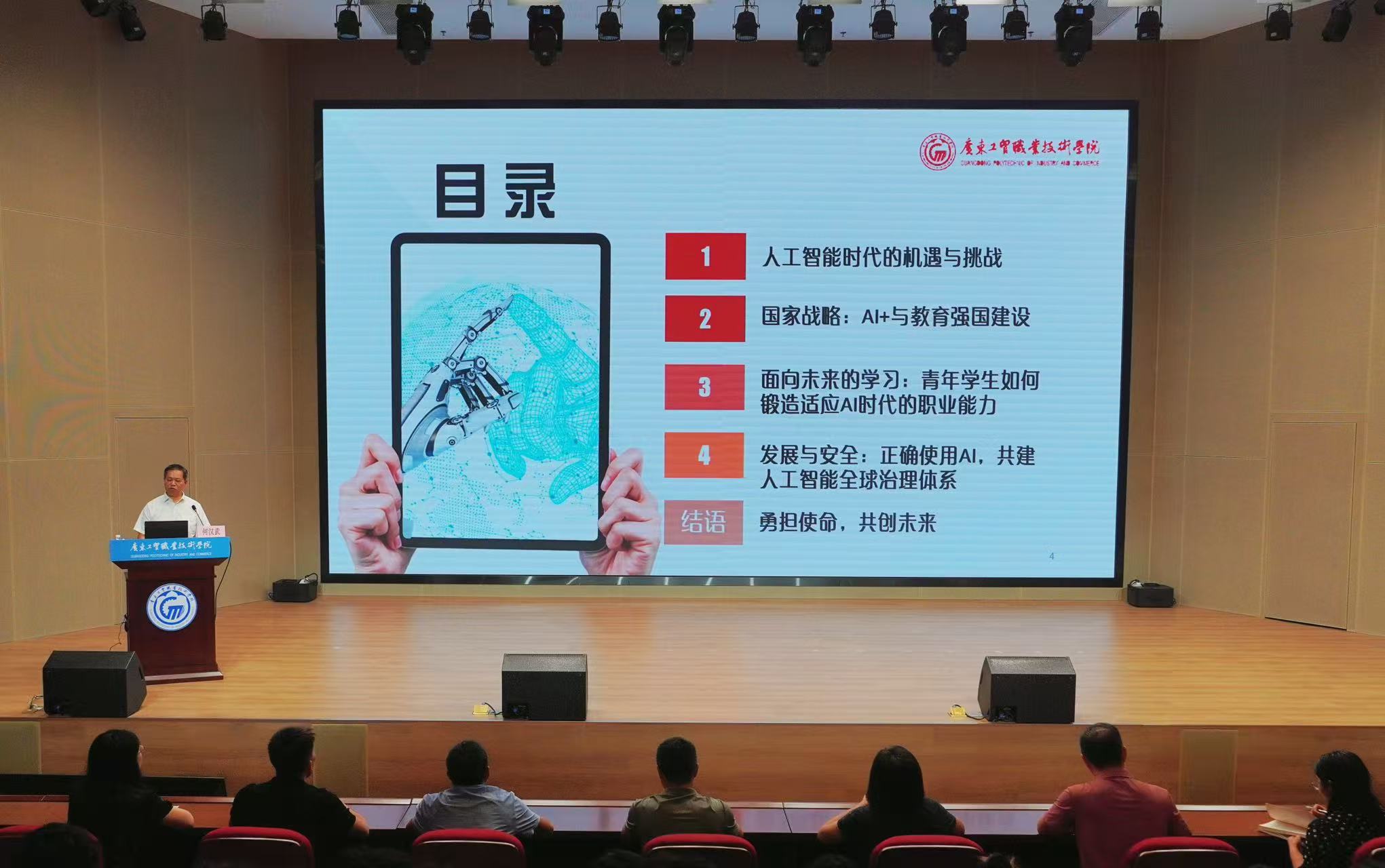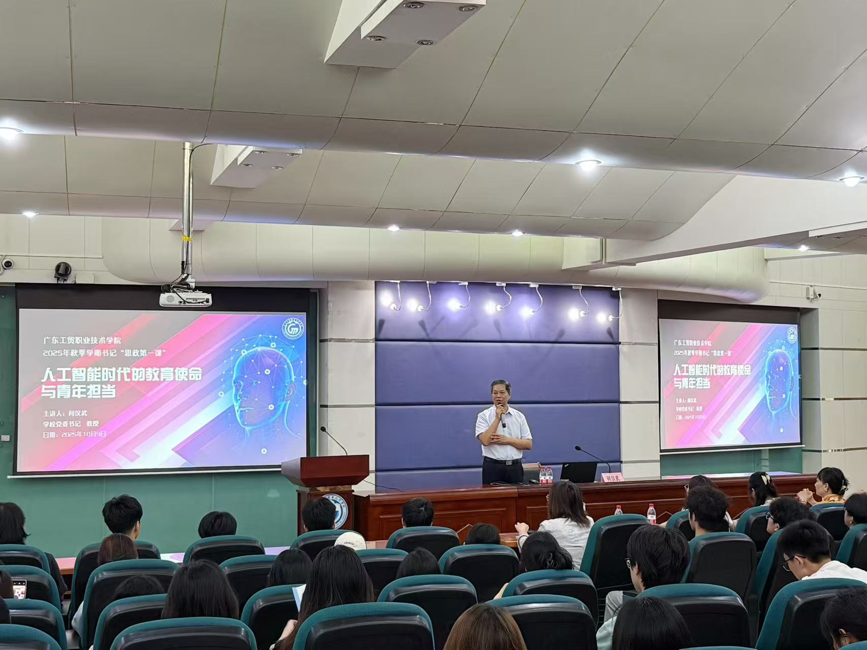 为深入贯彻习近平总书记关于思政课建设的重要指示批示精神,强化学校党政领导抓思政课建设的主体责任,根据《广东省教育厅关于做好2025年秋季学期大中小学校党组织书记、校长上第一堂思政课工作的通知》要求,学校党委书记何汉武教授以“人工智能时代的教育使命与青年担当”为题,于2025年9月29日和10月9日,分别在白云校区博学楼报告厅、天河校区西区学术报告厅为师生讲授了2025-2026学年秋季学期“思政第一课”暨工贸大讲堂第3期。马克思主义学院教师、学工干部、辅导员及学生代表共近800人聆听讲座。课程围绕国家战略、实践路径与治理体系,深入阐释人工智能时代职业教育的使命与青年责任。