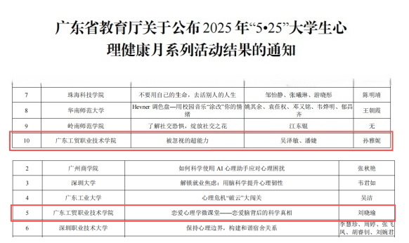 近日,广东省教育厅公布了2025年“5·25”大学生心理健康教育月系列活动获奖名单。我校共有两项作品获奖,分别是:心理科普短视频作品《被忽视的超能力》荣获特等奖,作者为吴泽敏(汽车工程学院)、潘婕(工商管理学院)两位同学,指导教师为学生工作部孙雅妮老师;心理微课作品(教师作品)《恋爱心理学微课堂——恋爱脑背后的科学真相》荣获一等奖,作者为学生工作部刘晓瑜老师。