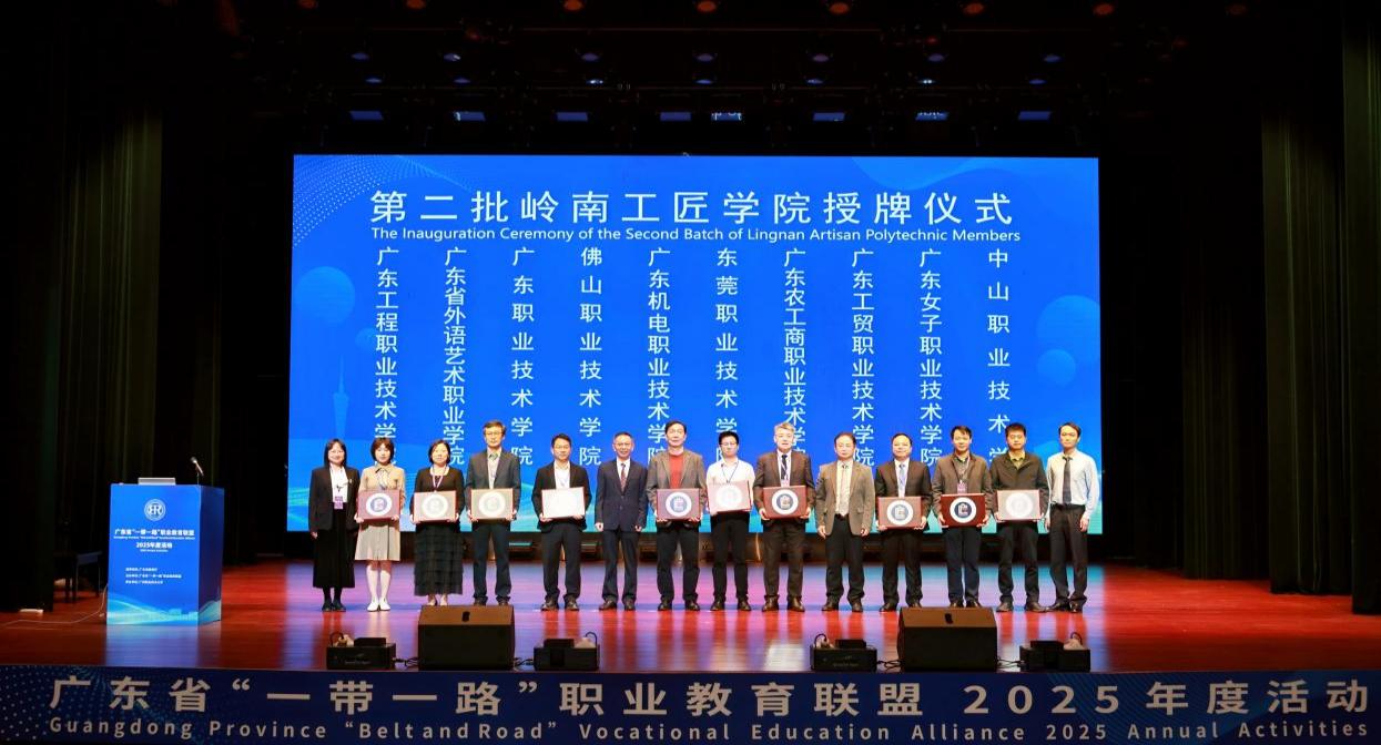 我校成功入选第二批 广东省“岭南工匠学院” 建设单位,党委副书记揭英荣代表学校上台接受授牌,学校海外办学成功案例同步在会场展示,获得同行广泛关注。