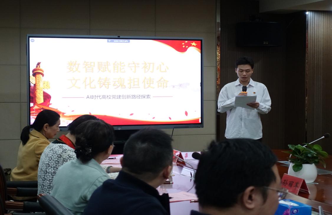 学生党员代表李文杰作了“数智赋能守初心 文化铸魂担使命——AI时代高校党建创新路径探索”的主题发言,向老党员们汇报了工商管理学院学生党支部结合时代发展,利用新技术赋能党建工作,传承红色基因,探索“党建+文化育人”的思考与实践。