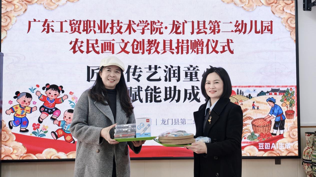 活动尾声,学院向龙门县第二幼儿园捐赠了由教师团队自主研发的系列农民画文创教具。这些教具不仅为幼儿园常态化、系统化开展非遗园本课程提供了坚实的物质支撑,更体现了高校专业资源对乡村教育的精准赋能。
