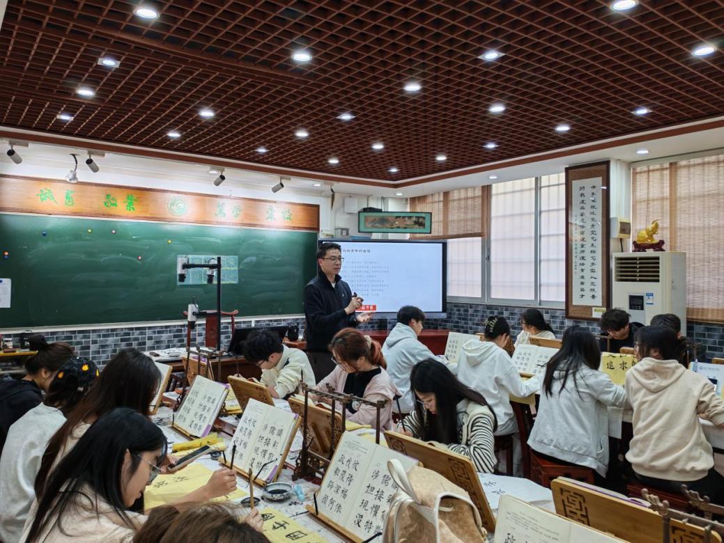 为让阅读分享更具感染力,现场特别设置了书法实践环节。李繁带领同学们挥毫泼墨,将总书记勉励青年的 “人才有高下,知物由学”“苟日新,日日新,又日新”等古语落到宣纸上。同学们凝神聚力,或笔力遒劲,或清秀雅致,在笔墨流转间体悟经典内涵与全会精神的共鸣,现场墨香氤氲、气氛热烈。
