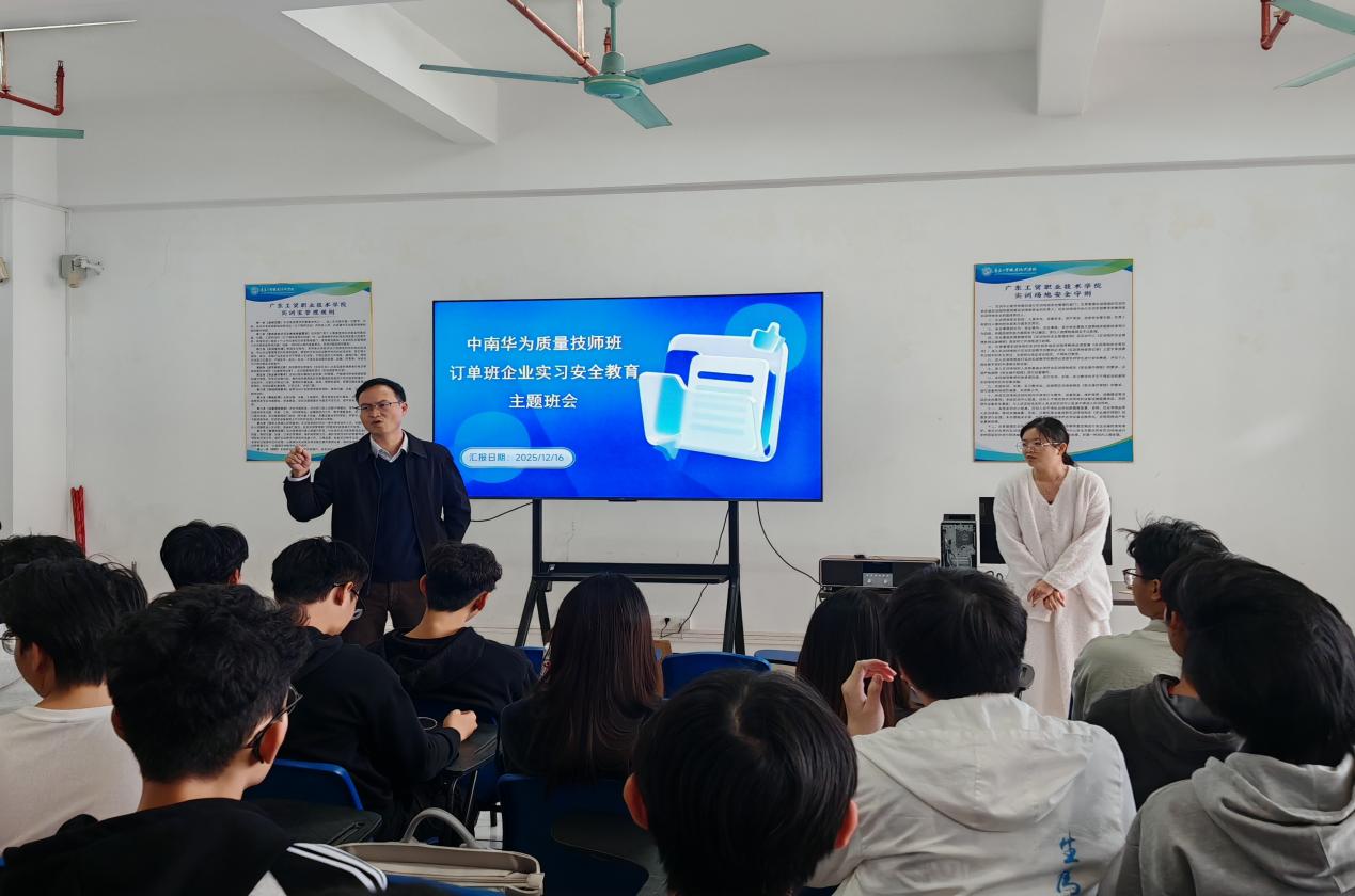 班会伊始,林诺怡和黄美红老师结合华为企业实习岗位特点与相关工作场景,强调了实习安全的重要意义,随后,通过PPT展示、案例分析等形式,从多个维度对学生开展了安全教育。