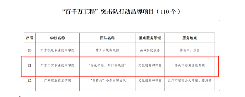 接共青团广东省委员会通知,在“2025年广东大中专学生志愿者暑期文化科技卫生‘三下乡’社会实践活动暨广东青年大学生‘百千万工程’突击队行动品牌项目、典型案例”评选中,我校斩获佳绩: