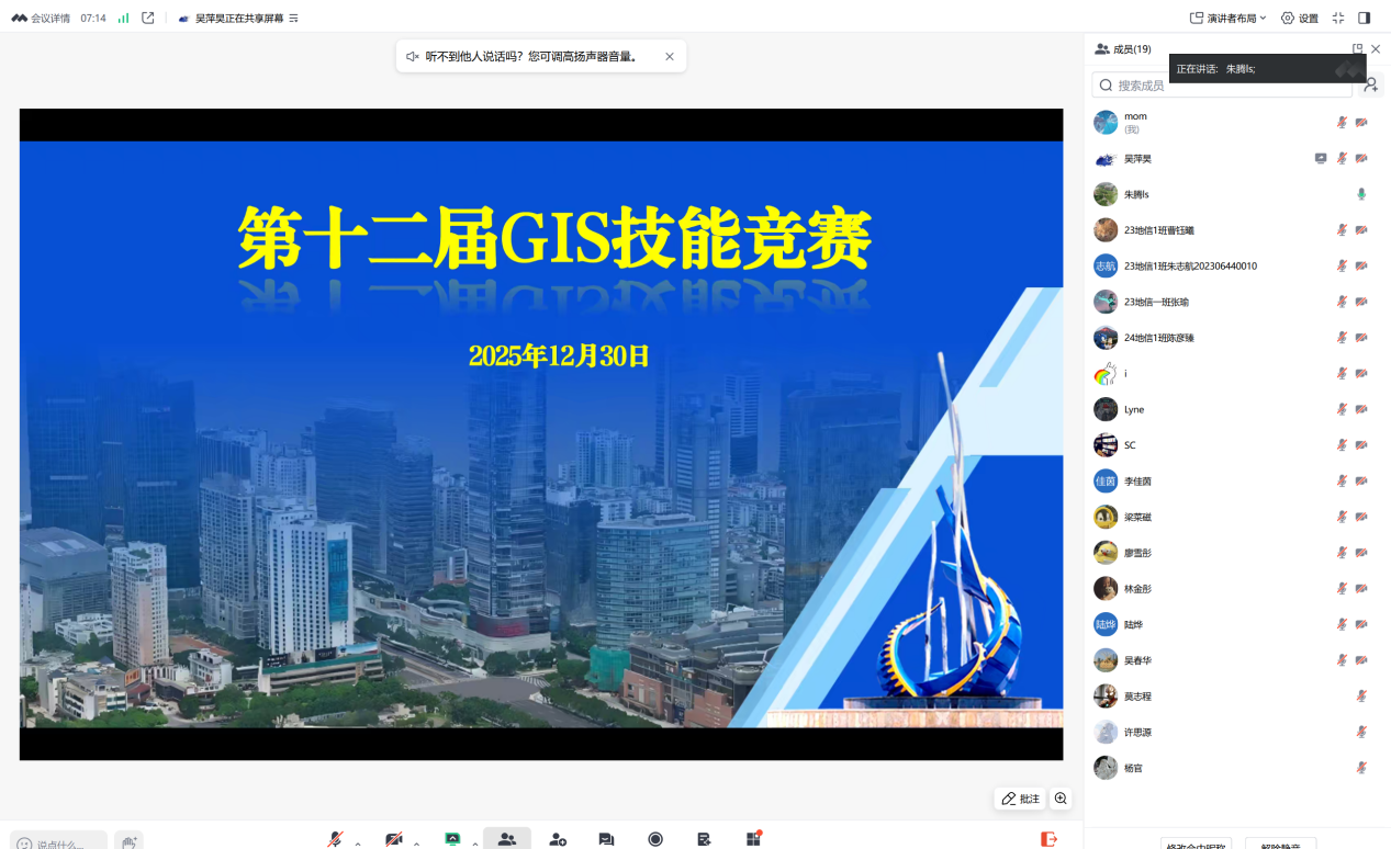2025年12月30日晚上七点整,测绘遥感信息学院举办了第十二届GIS技能竞赛(线上),地理信息系主任朱腾、专任教师吴春华、申晨出席了本次会议,地信系副主任吴萍昊主持,上述四位老师担任评委,总计20余名师生参会。