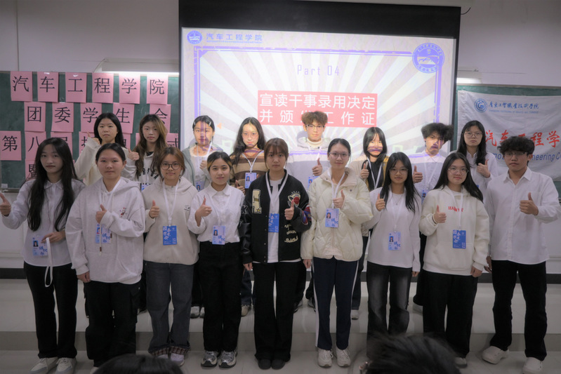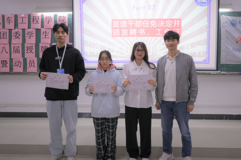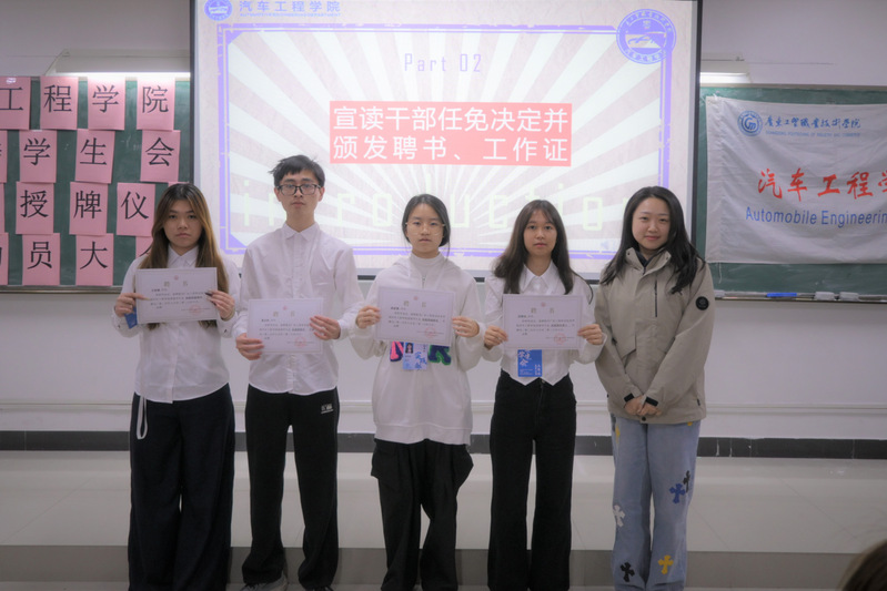 为进一步健全学生组织管理架构,充分发挥学生组织的桥梁纽带作用,强化学生干部的服务意识,培育协作精神,提升整体战斗力。12月25日下午,汽车工程学院团委学生会新一届授牌仪式暨动员大会在明德楼2-302顺利召开。汽车工程学院团委书记桂晶晶,辅导员钟梅、郭朋朋、吴俊迪、詹琪琪以及团委学生会全体干部干事出席本次大会。