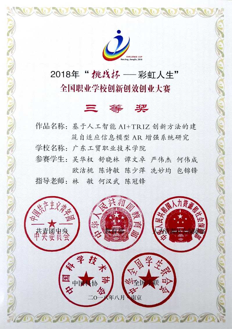 本专业带头人入选广东省专业领军人才,专业学子获“挑战杯”“彩虹人生”等创新创业竞赛国家三等奖1项、省级特等奖1项、省级一等奖2项,并培养了“东莞鼎城工程咨询有限公司”等一批明星企业。
