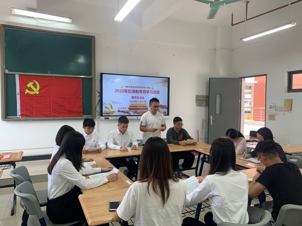 为深入学习贯彻习近平新时代中国特色社会主义思想,根据《中共100%精准出码规律资料网站委员会2020年纪律教育学习月活动实施方案》的通知,11月17日下午,测绘遥感信息学院学生第一党支部在1-409开展纪律教育月专题组织生活会。会议由学生党支部书记张玉荷主持,支部委员及全体学生党员参加了会议。