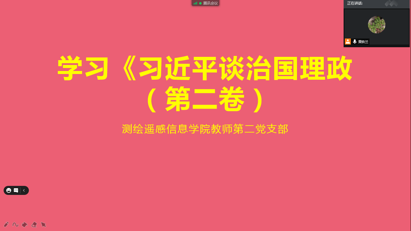2020年5月12日,为了深入贯彻党中央学习思想,全面提升教师在党的领导下做“四有教师”的理想信念,测绘遥感信息学院教工第二党支部在通过腾讯会议举行《习近平谈治国理政》第二卷学习活动。党支部书记黄铁兰同志及全体党员教师参与此次学习活动。