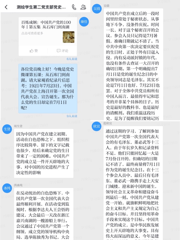 4月19日晚,测绘学院学生第二党支部开展“党史微课”系列活动,组织全体党员通过学习强国平台云端学习观看了百集微纪录片《百炼成钢:中国共产党的100年》第五集:从石库门到南湖,并进行了交流讨论。本次党课由支部书记冯臻佳老师主持、主讲。
