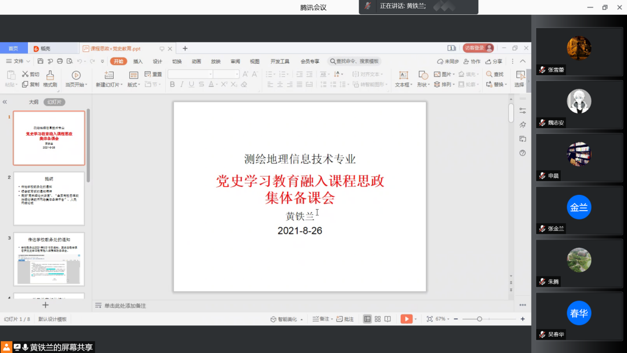 2021年8月26日,测绘地理信息技术专业组织开展了“党史学习教育融入课程思政集体备课会”。会议由教师第二党支部书记、测绘地理信息系主任黄铁兰主持,测绘地理信息专业教师常德娥、喻怀义、张金兰、吴春华、朱腾、申晨、魏志安、张雪蕾老师参会。本次会议共分为四个议题。