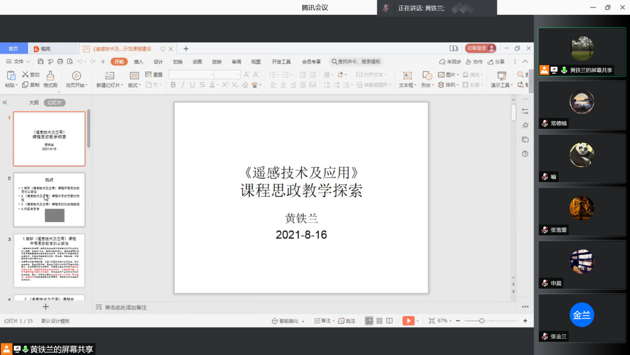 会议的第二议题,是各课程负责人分享在课程思政建设过程中的思路和方法。首先,由常德娥老师作了关于《GIS技术及应用》课程的课程思政元素内容建设分享。常老师从课程内容设计和课程思政元素挖掘两方面向大家详细介绍了各项目。接着,黄铁兰老师分享了《遥感技术及应用》课程思政教学探索的分享。黄老师从课程开展思政教育的必要性、课程思政元素的挖掘、课程思政的实施路径、课程思政案例展示、课程思政的问题及展望五个方面进行了详细的阐述。然后,由张金兰、喻怀义、吴春华、朱腾等老师,分别分享了《地图制图技术及应用》、《测量技术基础》、《GIS空间分析》、《科技论文写作》等课程中如何开展课程思政建设的思路。