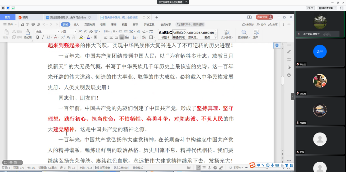 2021年7月18月,按照暑假党史学习计划,测绘学院教师第二支部通过腾讯会议召开党史学习研讨会,深入学习《习近平总书记在庆祝中国共产党100周年庆祝大会的讲话》。会议由党支部书记黄铁兰同志主持,第二支部全体党员参加。
