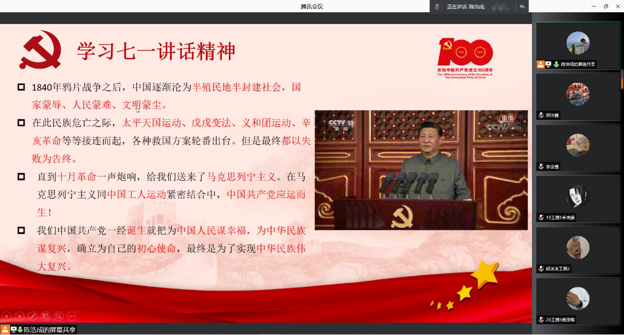 陈浩成首先带领全体同学们学习了习近平总书记在庆祝中国共产党成立100周年大会上的重要讲话,讲话全面回顾一百年来我们党围绕实现中华民族伟大复兴,团结带领中国人民开辟的伟大道路、创造的伟大事业、取得的伟大成就,庄严宣告我们实现了第一个百年奋斗目标,在中华大地上全面建成了小康社会,深刻总结了伟大建党精神,系统阐述了以史为鉴、开创未来的“九个必须”。在讲话中,习近平总书记寄语青年,要以实现中华民族伟大复兴为己任,要增强做中国人的志气、骨气、底气,不负时代、不负韶华、不负党和人民的殷切期望!