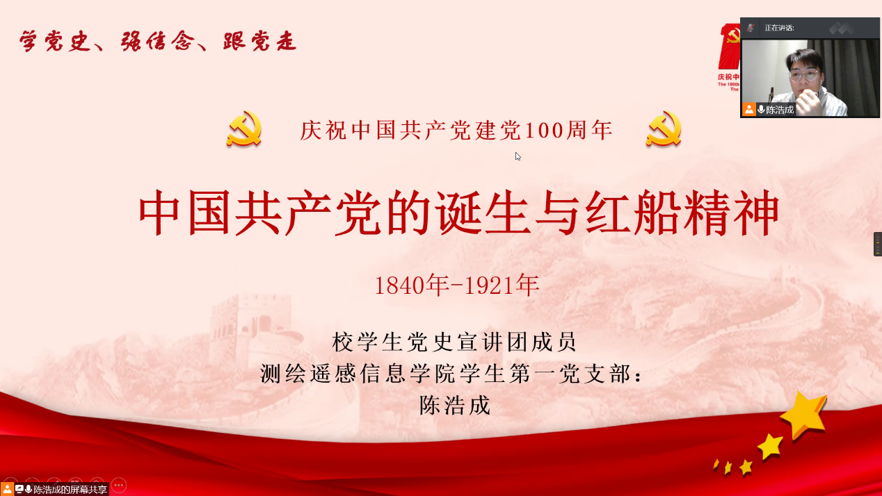10月21日,校学生党史宣讲团成员、测绘遥感信息学院学生第一党支部预备党员陈浩成面向测绘遥感信息学院2020级工程测量技术专业4班、5班学生开展第四次线上党史宣讲。