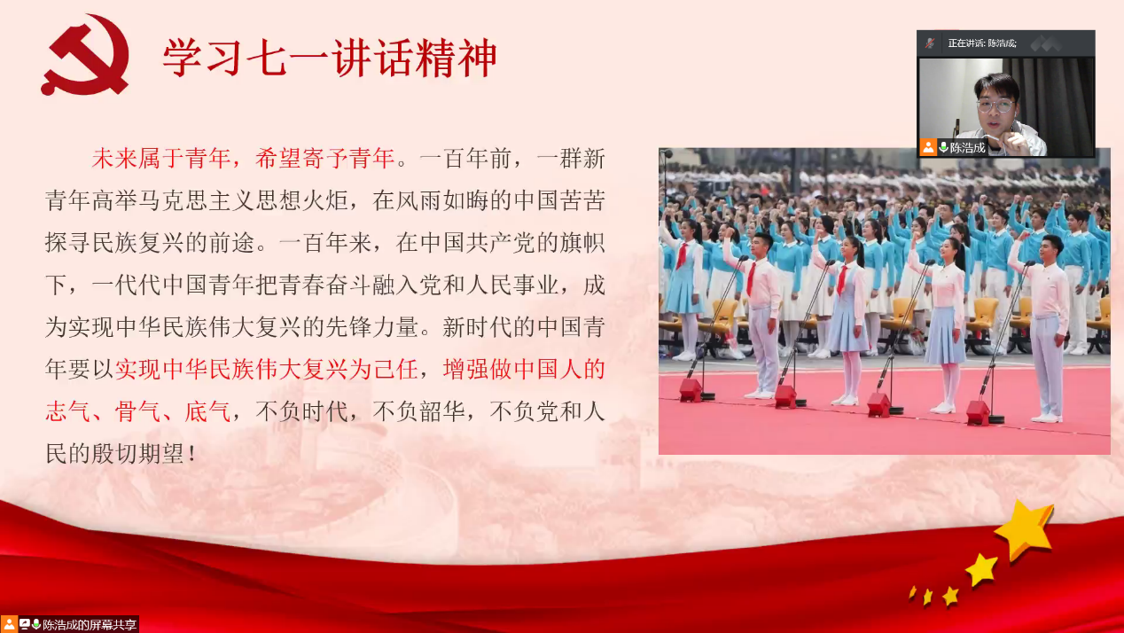 陈浩成首先带领全体同学们回顾了习近平总书记在庆祝中国共产党成立100周年大会上的重要讲话,以习近平总书记的讲话为切入点,带领着同学们全面回顾一百年来我们党围绕实现中华民族伟大复兴,团结带领中国人民开辟的伟大道路、创造的伟大事业、取得的伟大成就。并且在宣讲中引用习近平总书记寄语青年的话语,呼吁大家:要以实现中华民族伟大复兴为己任,要增强做中国人的志气、骨气、底气,不负时代、不负韶华、不负党和人民的殷切期望!实现中华民族伟大复兴少不了在座的各位同学的努力。
