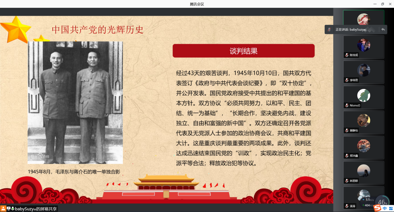 测绘遥感信息学院学生第一党支部自3月份以来利用腾讯会议和微信“移动微课堂”持续开展“党员讲党史”系列活动,以不同时期的典型事例、历史人物、精彩故事为线索,通过讲述党史故事进一步教育引导全体学生党员坚定理想信念,强化党性观念。10月24日晚,支部开展了第二十一次党史学习,由学生第一党支部书记张玉荷同志主持,支部全体学生党员参会。