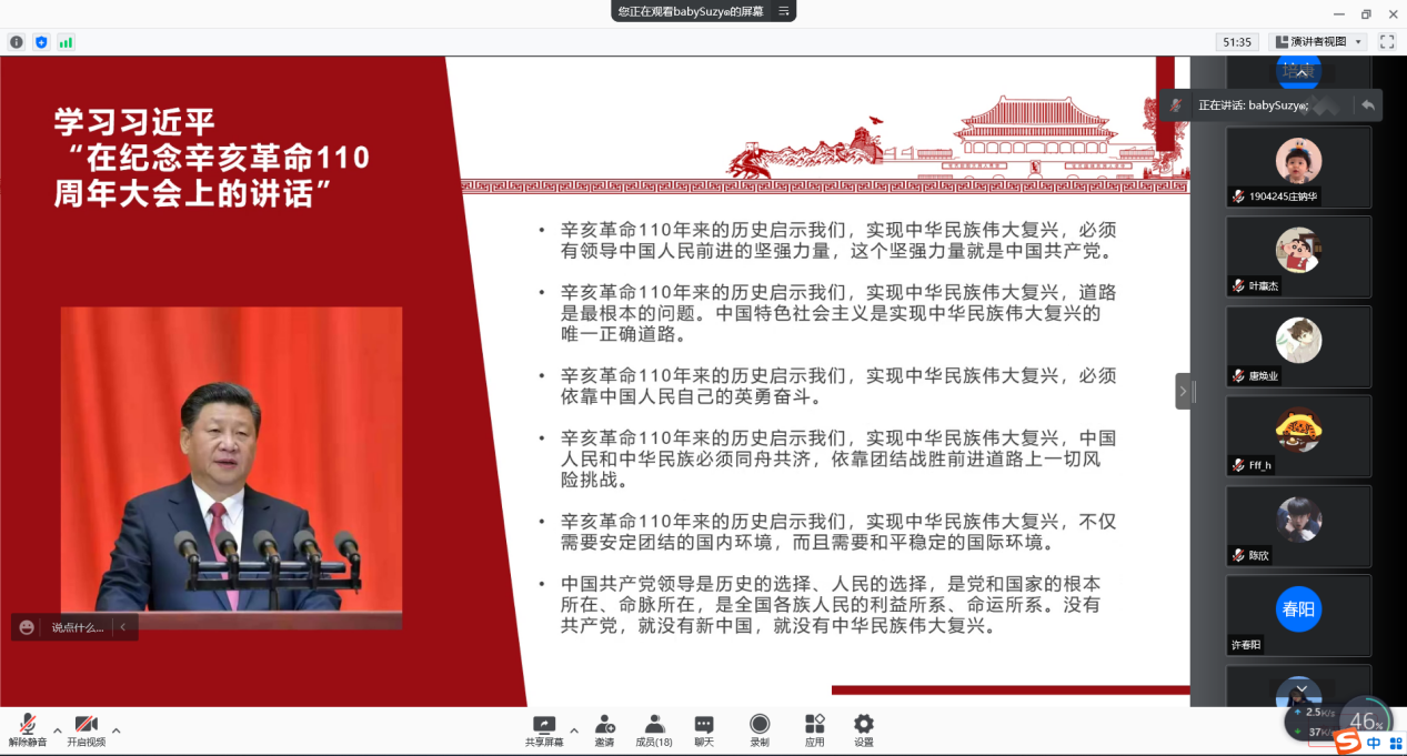 在本次学习中,全体学生党员首先学习了习近平总书记在纪念辛亥革命110周年大会上的讲话。辛亥革命是复兴征程上巍然屹立的里程碑,110年的历史启示我们,实现中华民族伟大复兴,必须依靠中国人民自己的英勇奋斗来实现。学生党员们认真学习并讨论习近平总书记的重要讲话,并结合自身的学习,畅谈收获体会,纷纷表示要发扬辛亥革命精神,为民族复兴接续奋斗!