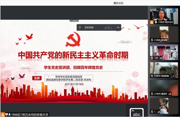 为深入开展党史学习教育,加强青年学生思想政治引领,推动党史学习教育走深走实,11月16日晚,学校党史宣讲团成员、测绘遥感信息学院学生第二党支部预备党员洪冰纯面向测绘学院21级地理信息1、2、3班开展线上党史宣讲活动,覆盖学生122人,学习党的十九届六中全会精神以及“中国共产党的新民主主义革命时期”主题内容。