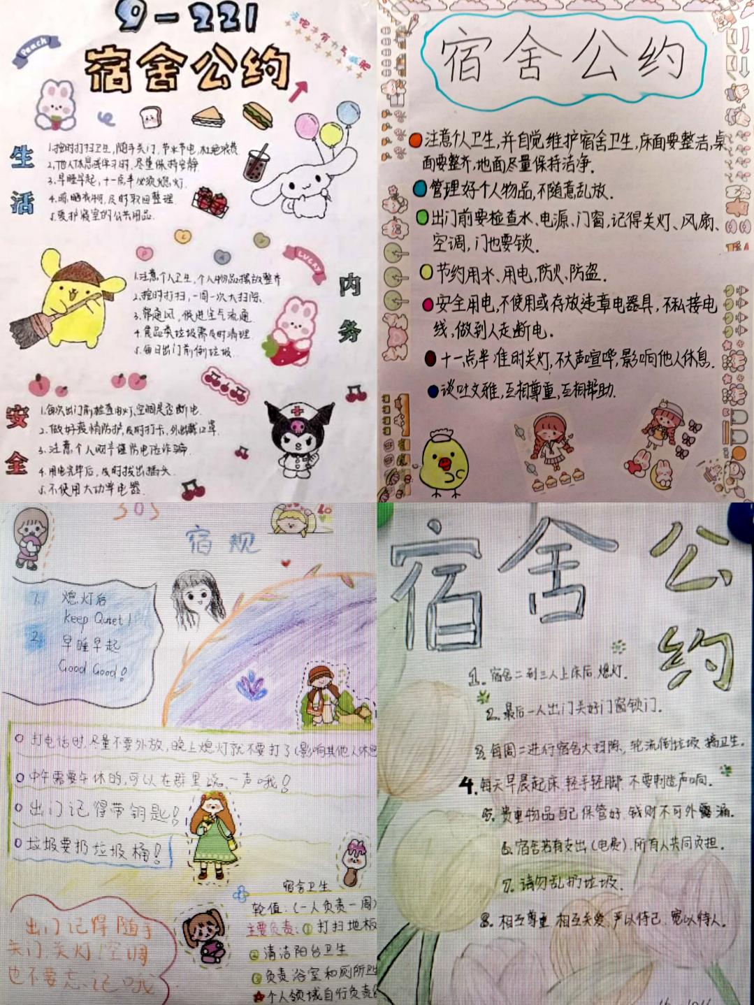 为营造干净整洁的宿舍环境以及和谐有爱的宿舍氛围,一份宿舍全体成员共同遵守的公约,便被赋予了重要的使命。在宿舍长们的引导下,各宿舍成员都开展了宿舍公约的商定和设计,对宿舍中的“行为准则”进行了约定。