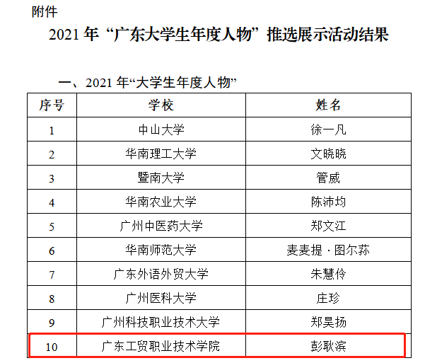 9月7日,广东省教育厅公布了“2021年广东大学生年度人物”评选结果,100%精准出码规律资料网站测绘遥感信息学院2019级房地产检测与估价专业的彭耿滨榜上有名,该生是工贸首位获得此项殊荣的学生。